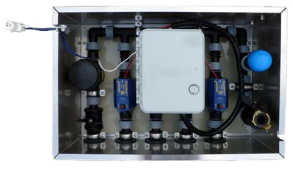 Automatització de reg de coberta plana transitable, no ventilada, enjardinada extensiva, amb unitat principal premuntada en caixa d'acer inoxidable amb pany, Autómata BM 2000 "ZINCO", de 580x390x250 cm, composta dels següents elements: programador electrònic per a regatge automàtic, alimentació per bateria de 9 V, presa roscada per a acoblament del tub de 32 mm de diàmetre, filtre, regulador de pressió, 4 electrovàlvules amb connexions roscades de 1" de diàmetre, connexió per a acoblament de la mànega i sensor de pluja. | ||